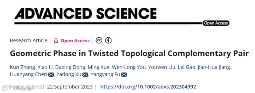 基于自旋轨道耦合引发的几何相位在光学领域引起了广泛的关注,尤其为亚波长尺度下自由操控光场提供了重要平台。然而这种几何相位仅适用于圆偏振光,在应用于缺乏固有自旋自由度的经典波场时面临着重大挑战。针对这一瓶颈问题,南京航空航天大学的伏洋洋教授、苏州大学的徐亚东教授和厦门大学的陈焕阳教授等合作,近日提出了一种基于拓扑互补对概念实现几何相位的新范式,并在声波体系中进行了实验验证,为亚波长声场调控提供了新思路。相关成果以“Geometric phase in twisted topological complementary pair”为题于9月22日在线发表在国际著名期刊《Advanced Science》上(DOI:10.1002/advs.202304992)。伏洋洋教授、徐亚东教授和陈焕阳教授为该工作的共同通讯作者;南京航空航天大学2019级本科生张琨、博士生李潇和董大兴副教授为共同第一作者;南京航空航天大学薛明讲师、尤文龙教授、刘友文教授、苏州大学高雷教授和蒋建华教授亦对该工作有重要贡献。
