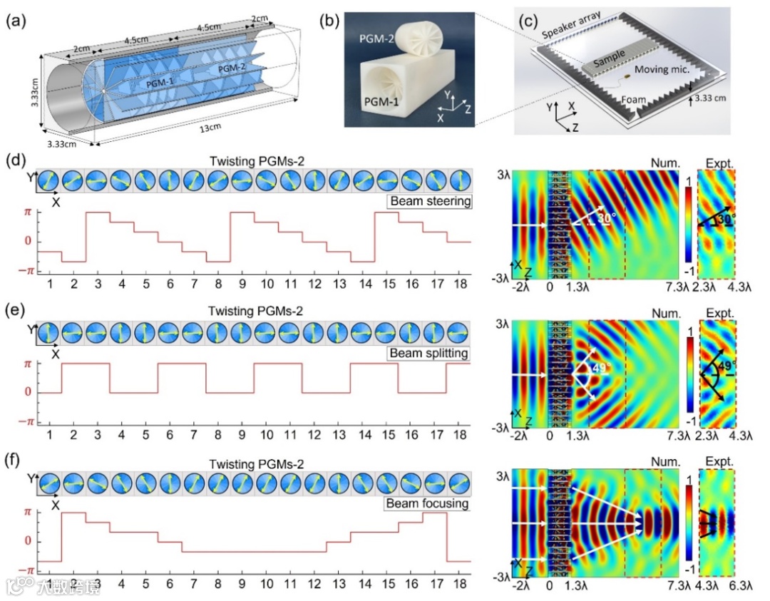 为了验证上述理论,本工作利用具有相反ITC的一对PGMs设计声学TCP模型,如图2(a)所示,并在声波体系中证明了亚波长尺度下几何相位。通过发展耦合波理论,本工作对可扭转的TCP圆柱波导结构进行了解析计算。比如,q=2的TCP波导结构的结果如图2(c)所示,完美的透射率与线性变化的透射相位展示了TCP结构高效、精准操控几何相位的特性。图2(d)为q=1,2,3,4四种不同情况下TCP波导结构中的几何相位,进一步验证了理论的正确性。本工作采用卷曲空间超材料设计了声学TCP,并构建了声学几何相位超表面(18个TCP构成的阵列结构),通过对每个TCP扭转不同的角度来调制超表面中的几何相位,实现了平面声场可重构操控(图3)以及涡旋声场可调谐产生(图4)等现象。