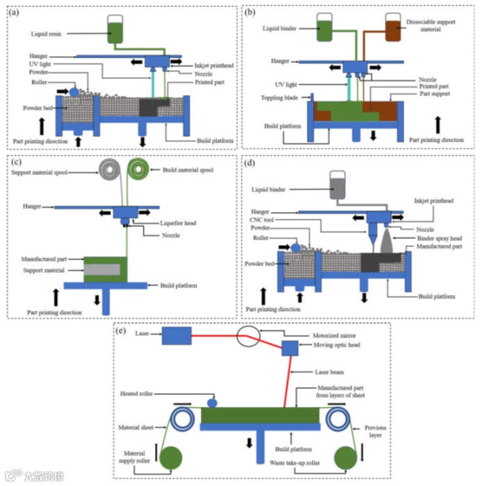 (a)还原光聚合,(b)材料喷射,(c)材料挤出,(d)粘合剂喷射和(e)片材层压聚合物增材制造工艺的说明