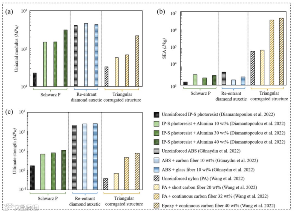 条形图展示了增强和未增强聚合物晶格材料的力学性能:(a)单轴模量;(b)比能量吸收(SEA)和(c)极限强度