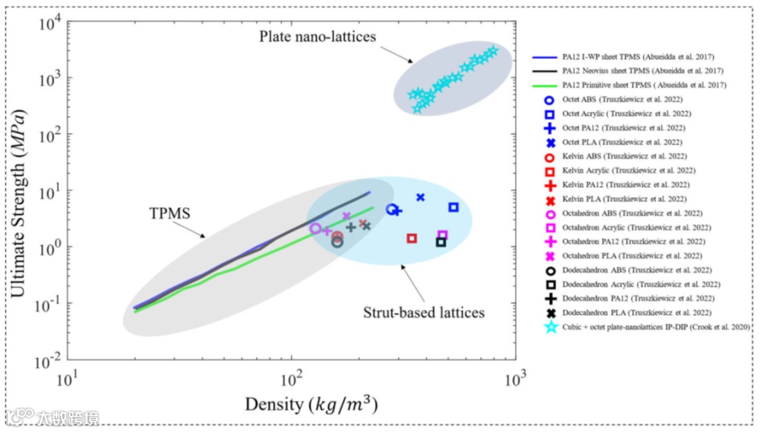 各种聚合物超材料单轴压缩物理试验的极限强度与超材料密度