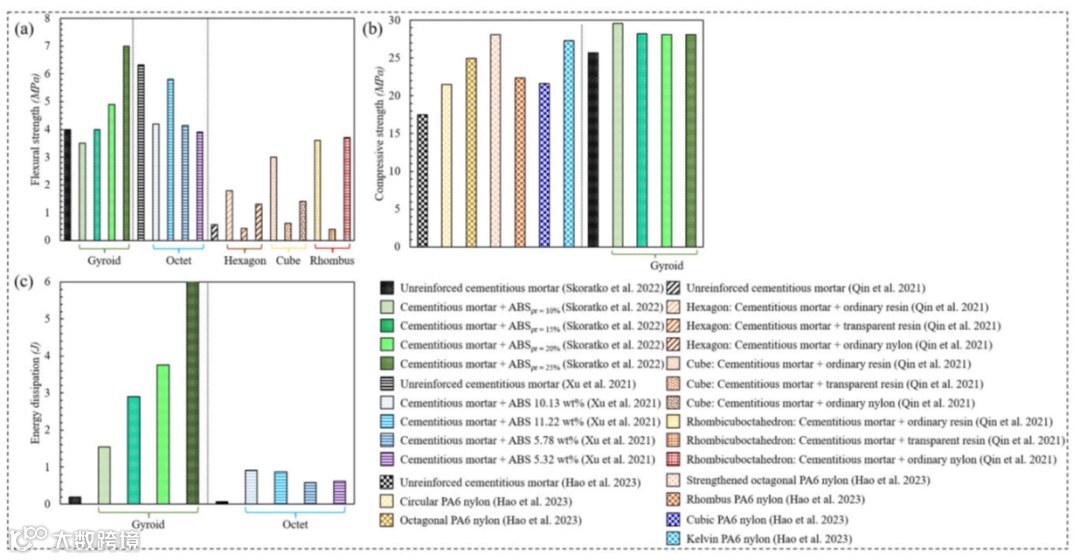 条形图展示了增强和未增强水泥基复合材料的力学性能:(a)抗弯强度;(b)抗压强度和(c)能量耗散