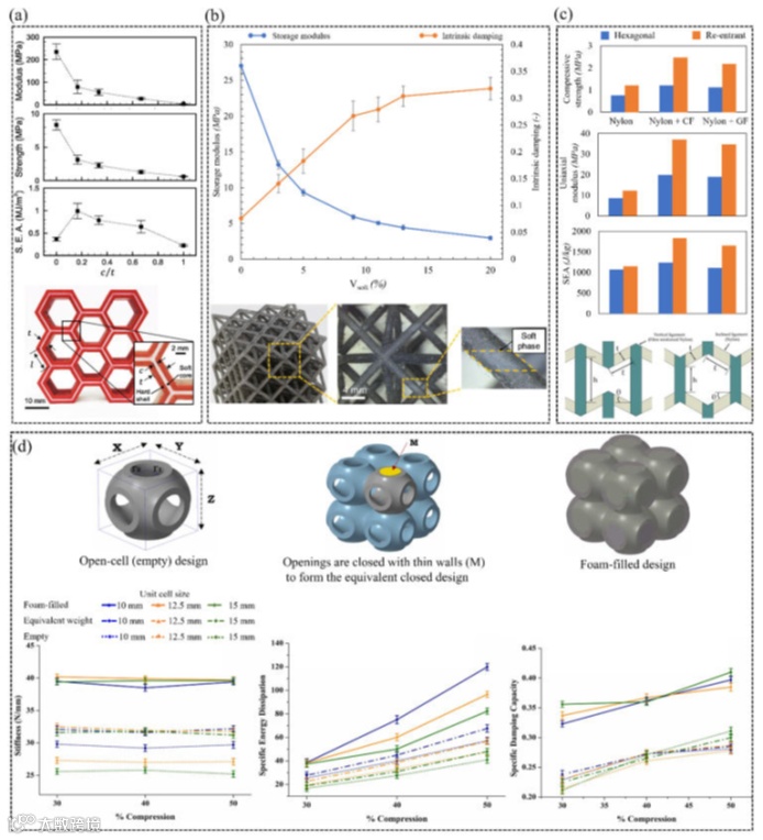 多材料聚合物晶格材料的设计和性能说明。(a)PLA和TPU蜂窝结构的设计和力学性能演示;(b)改变嵌入刚性CFRP构件中的软相体积分数对其储能模量和固有阻尼影响的证明;(c) 由于在尼龙结构中嵌入玻璃/纤维增强材料,凹角和六边形晶格材料的抗压强度、单轴模量和SEA得到了改善;d)多材料SU晶格材料的设计与力学性能对比