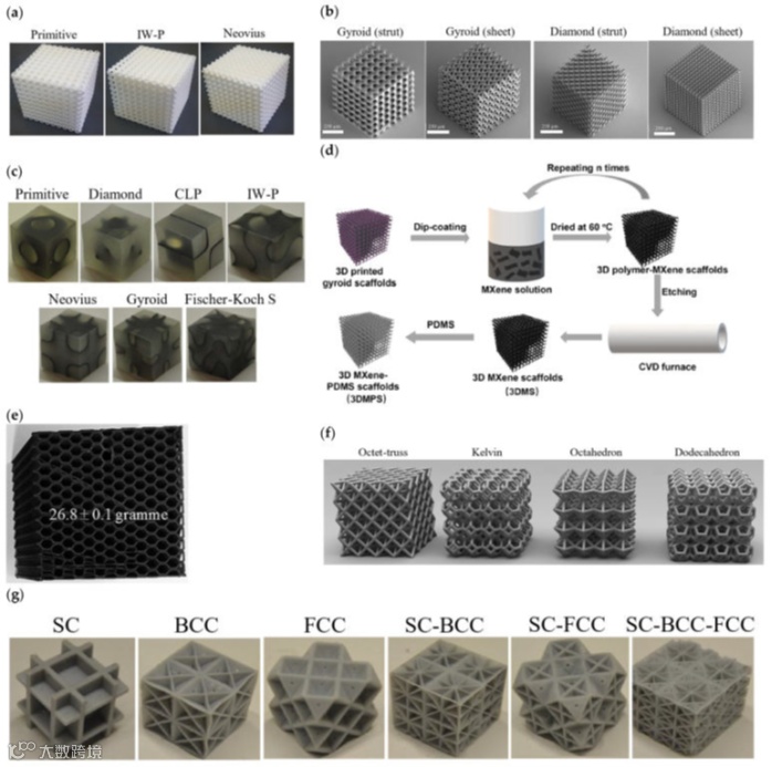 用于力学测试的各种聚合物样品。(a)基于薄板的TPMS立方体试样;(b)基于支柱和薄板的TPMS立方体试样;(c)片状TPMS连续网络结构复合材料试样;(d)使用基于聚合物、基于支柱的螺旋形TPMS制造3D MXene支架的步骤;(e)六边形蜂窝结构;(f)基于支柱的立方体试样;(g)基于均匀和混合支柱的立方体试样