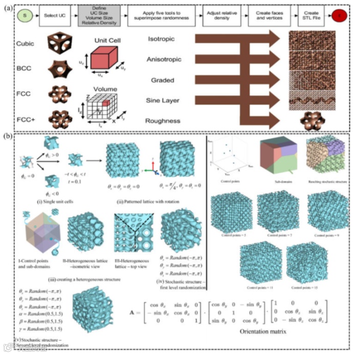 (a)可用于建模体积的五种技术:各向同性随机性、各向异性随机性、分级随机性、分层随机性;(b)生成基于随机片材的晶格材料的框架;(i)螺旋结构的单晶胞的设计,(ii)各种图案化的基于TPMS的拓扑结构的旋转,(iii)使用控制点和子域创建异质最小表面随机晶格材料,(iv)通过螺旋子域的随机定向对异质结构进行一级随机化,(v)通过螺旋子域的随机定向对异质结构进行二级随机化