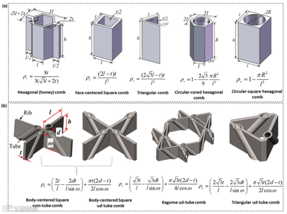 梳状晶格人工设计。(a)单拓扑晶胞形状;(b)具有管状结构的混合晶胞形状,用于减轻梳状晶格结构中的剪切屈曲效应