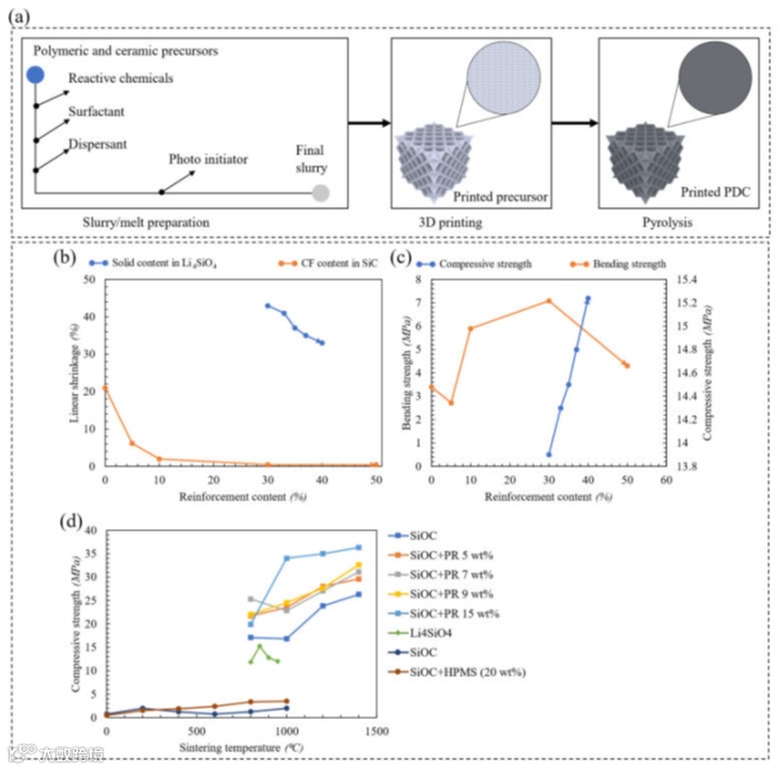 (a)生产增材制造的PDC晶格结构的总体布局;(b)演示了钢筋含量对PDC线性收缩的影响;(c)演示了钢筋含量对PDC的弯曲强度和抗压强度的影响;(d)烧结/热解温度对PDC抗压强度的影响