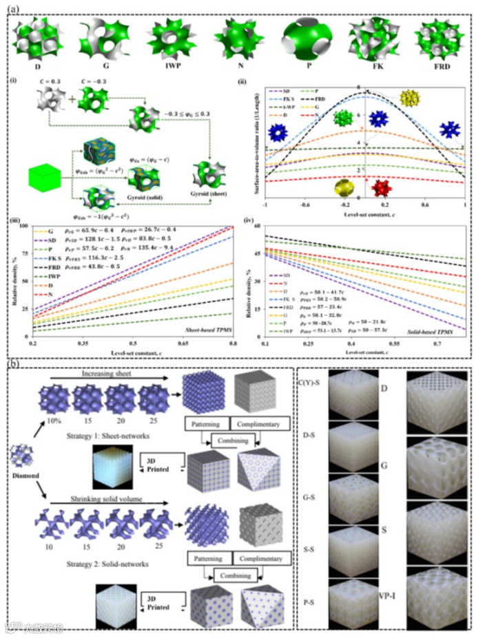 (a)关于如何隐式设计基于片材和基于韧带的TPMS晶格的说明,以及分别显示参数t和c以及所选TPMS晶格类型的相对密度和表面积与体积比之间关系的图。(b)使用基于聚合物的增材制造工艺和基材展示这些复杂结构的可打印性;(i)如何通过隐式设计策略构建基于片材和基于韧带/固体的TPMS架构,(ii)晶胞单元基于片材的TPMS的表面积与体积比与水平集参数变化之间的关系,(iii,iv)分别用于基于片材和韧带/固体TPMS体系结构的相对密度与任意参数之间的关系