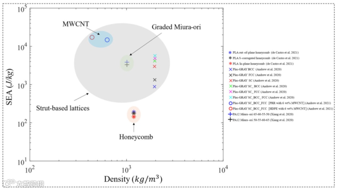 各种聚合物超材料冲击物理试验的比能吸收与超材料密度