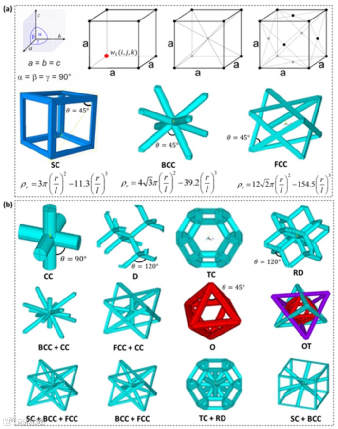 各种基于支柱的晶格的图示。(a)受布拉维(Bravais)晶格启发的基于单拓扑支柱的架构(b)其他基于复杂支柱的晶格形式