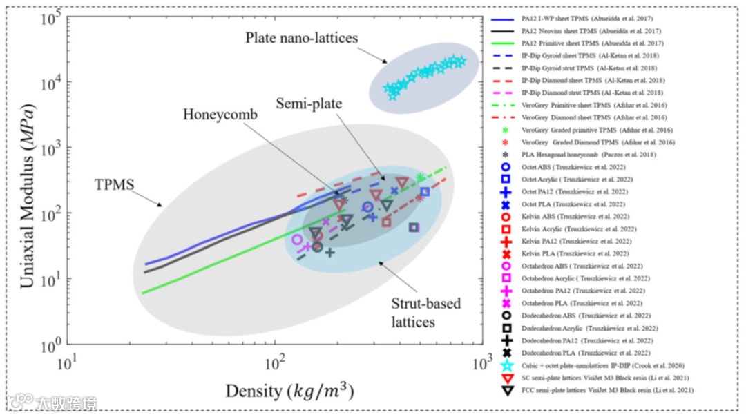 各种聚合物超材料单轴压缩物理试验的单轴模量与超材料密度