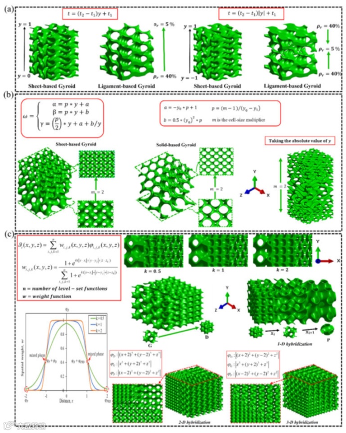 分级设计策略(a)相对密度、(b)单元大小和(c)基于TPMS的晶格的拓扑结构