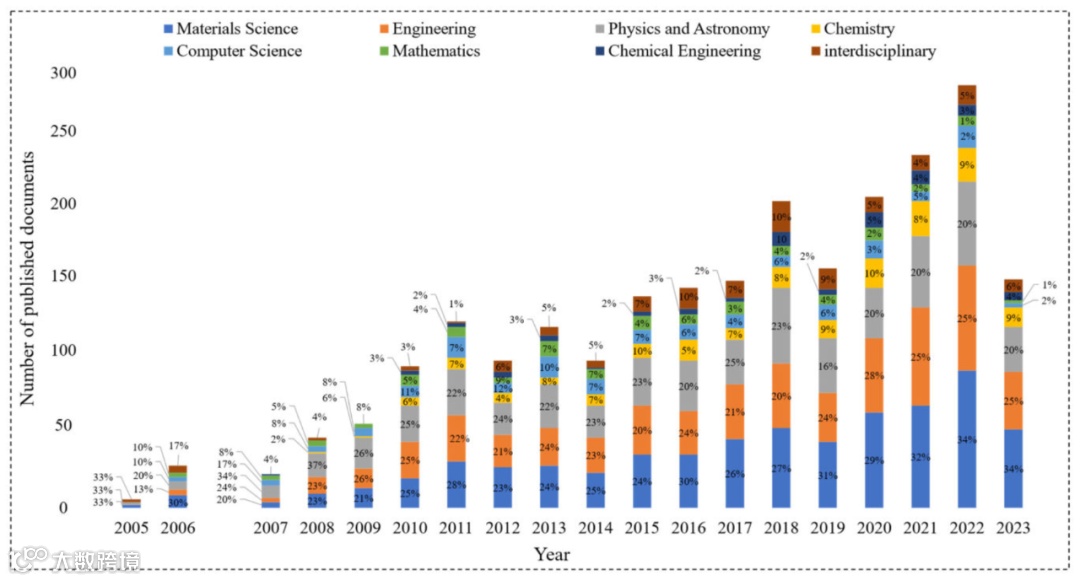 根据Scopus引文数据库,在过去的二十年里,各种主题领域对超材料和聚合物领域表现出越来越大的兴趣,如下图所示,图2描述了2005年至今不同主题领域发表的文件数量(即完整的研究文章、综述、会议论文和书籍章节)。每个条形图表示每年发布的文档总数,不同的颜色表示特定的主题区域。在已发表的文件总数中,对每个主题领域的贡献以百分比量化。可以注意到,大多数已发表的文献都与材料科学、工程和物理学科领域有关。事实上,从2009年起,这些主题领域每年的贡献几乎相等,因为它们在超材料和聚合物领域大量交织。请注意,跨学科学科领域包括医学、生物学、药理学和环境科学等领域,从2010年起呈现波动趋势。引文数据库显示,从2006年起,与超材料相关的出版物急剧增加。材料科学家和工程师一直在敦促我们探索超材料的物理、化学和机械力学特性。