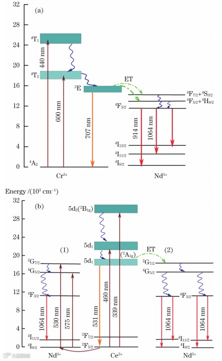 图1 Cr:Nd:YAG 和 Ce:Nd:YAG 的能级结构图