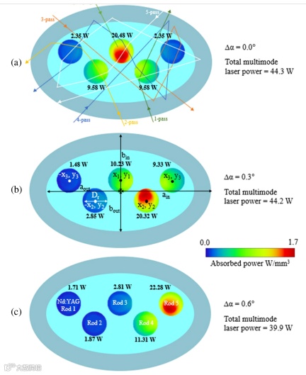 太阳能激光技术通常需要一个连续运行的高精度太阳能跟踪系统,但这会增加能耗并缩短系统的使用寿命。本文中,研究人员提出了一种多杆太阳能激光器泵浦方法,以增强非连续太阳跟踪条件下太阳能激光器的稳定性。利用定日镜,太阳辐射被重新定向到第一级抛物面聚光器,在其焦点处,非球面透镜进一步将太阳光集中到位于椭圆形泵腔内的 5 根 Nd:YAG 棒上。使用 Zemax 和 LASCAD 软件进行数值分析,结果表明 5 根直径为 6.5 mm、长度为 15 mm 的棒在 10% 激光功率损耗时的跟踪误差宽度为 2.20◦,比之前非连续太阳跟踪实验中的太阳能激光器高出 50%,且太阳能到激光的转换效率也达到了 2.0%。