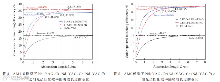 近期,北京理工大学赵长明教授研究团队以 Nd:YAG、Cr:Nd:YAG 及新 Ce:Nd:YAG 激光材料为研究对象,得到该三种激光材料在 AM1.5 地面太阳光谱下的重叠效率,分别为 17.34%、35.55%、33.41%;在 AM0 空间太阳光谱下的重叠效率分别为 15.4%、33.13%、32.92%。在接近光谱匹配效率的极限值时,AM1.5 模型下 Nd:YAG、Cr:Nd:YAG 及 Ce:Nd:YAG 所需吸收长度分别为 6.5、4.4 和 3.7 cm,AM0 模型下所需吸收长度分别为 7.3、4.3 和 3.8 cm。相关研究结果以“Nd:YAG、Cr:Nd:YAG 及 Ce:Nd:YAG 在太阳光泵浦下的光谱匹配研究”为题发表在《中国激光》上。