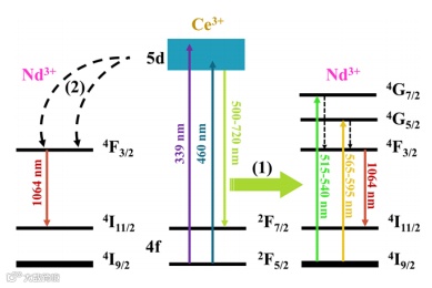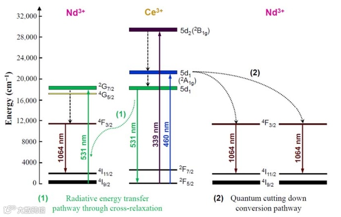 图1 Ce3+、Nd3+之间能量转移的机制,(1)为辐射,(2)为非辐射