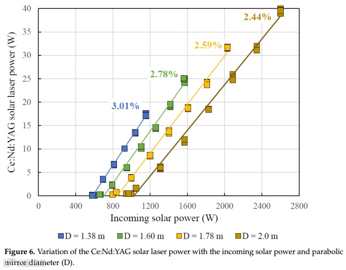 J. Almeida, D. W. Liang, D. Garcia, et al. 40 W continuous wave Ce:Nd:YAG solar laser through a fused silica light guide. Energies, 2022, 15, 3998.