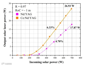 通过直径为 2 m 的抛物面聚光器,研究了侧面泵浦的 Ce:Nd:YAG 太阳能激光器。激光头由光导和 V 形泵浦腔形成,能有效地将来自抛物面镜的集中太阳光辐射耦合并重新分布到直径为 4 mm、长度为 35 mm Ce(0.1 at.%):Nd(1.1 at.%):YAG 激光棒上。矩形光导确保太阳辐射沿激光棒均匀分布,使其能够承受高度集中的太阳能。在抛物面镜的全收集面积下,获得了 40 W 的最大连续波太阳激光输出,据研究人员所知,这是从太阳能辐射泵浦的 Ce:Nd:YAG 介质中获得的最高连续波激光功率,比侧面泵浦的 Ce:Nd:YAG 太阳能激光器功率提高了两倍,比矩形光导的 Cr:Nd:YAG 太阳能激光器最高功率提高了 1.19 倍。该研究表明在适当的泵浦配置下,Ce:Nd:YAG 介质很有希望将太阳激光输出功率提高到一个更高的水平。