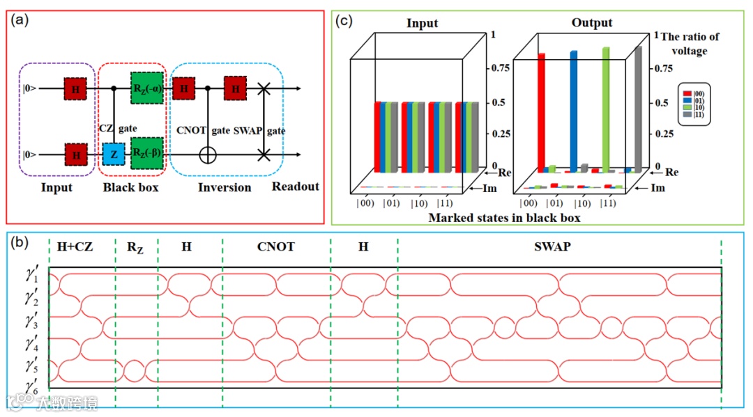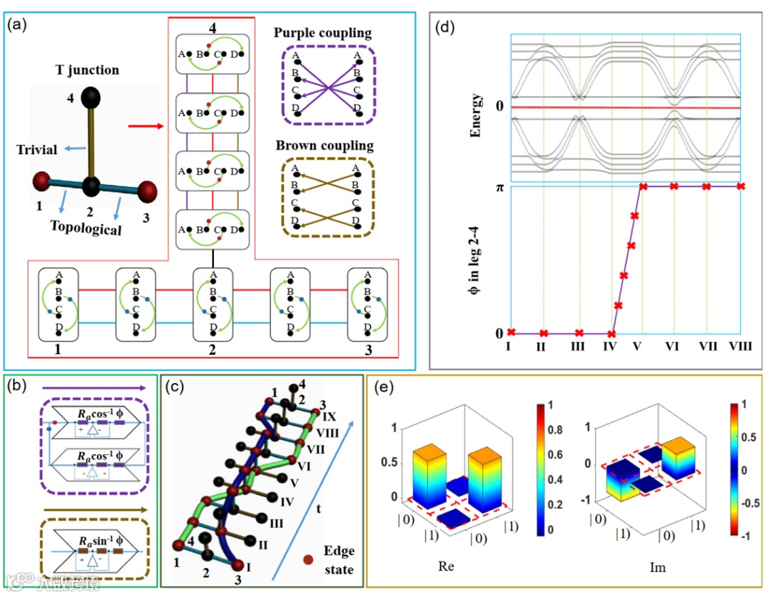 的转化,如图2(c)所示。在编织结束后,研究人员测量1-4每个节点的电压,并通过相应的计算,从而得到了编织矩阵。结果如图2(e)所示,可以清楚地看到输入态|0)和|1) 成功地被转化为