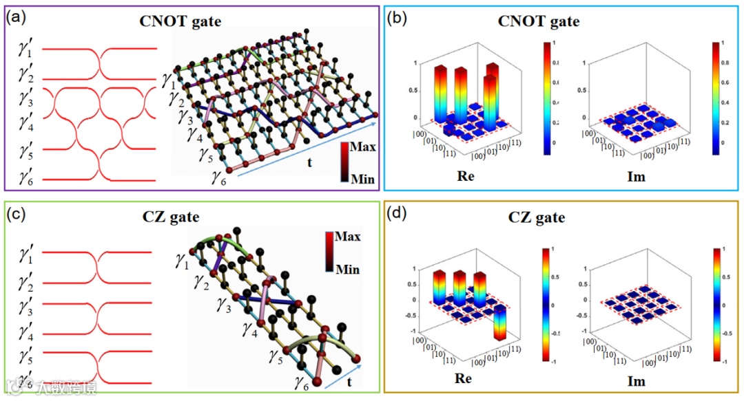 在具体实验中,与单比特门类似,研究人员基于上述编织过程以及图4(a)和4(c)中所展示编织顺序,完成了CNOT门和CZ门的整个编织过程。通过测量每个节点的电压,并进行相应的计算,得到了CNOT门和CZ门矩阵,结果如图4(b)和4(d)所示。对于CNOT门,输入态