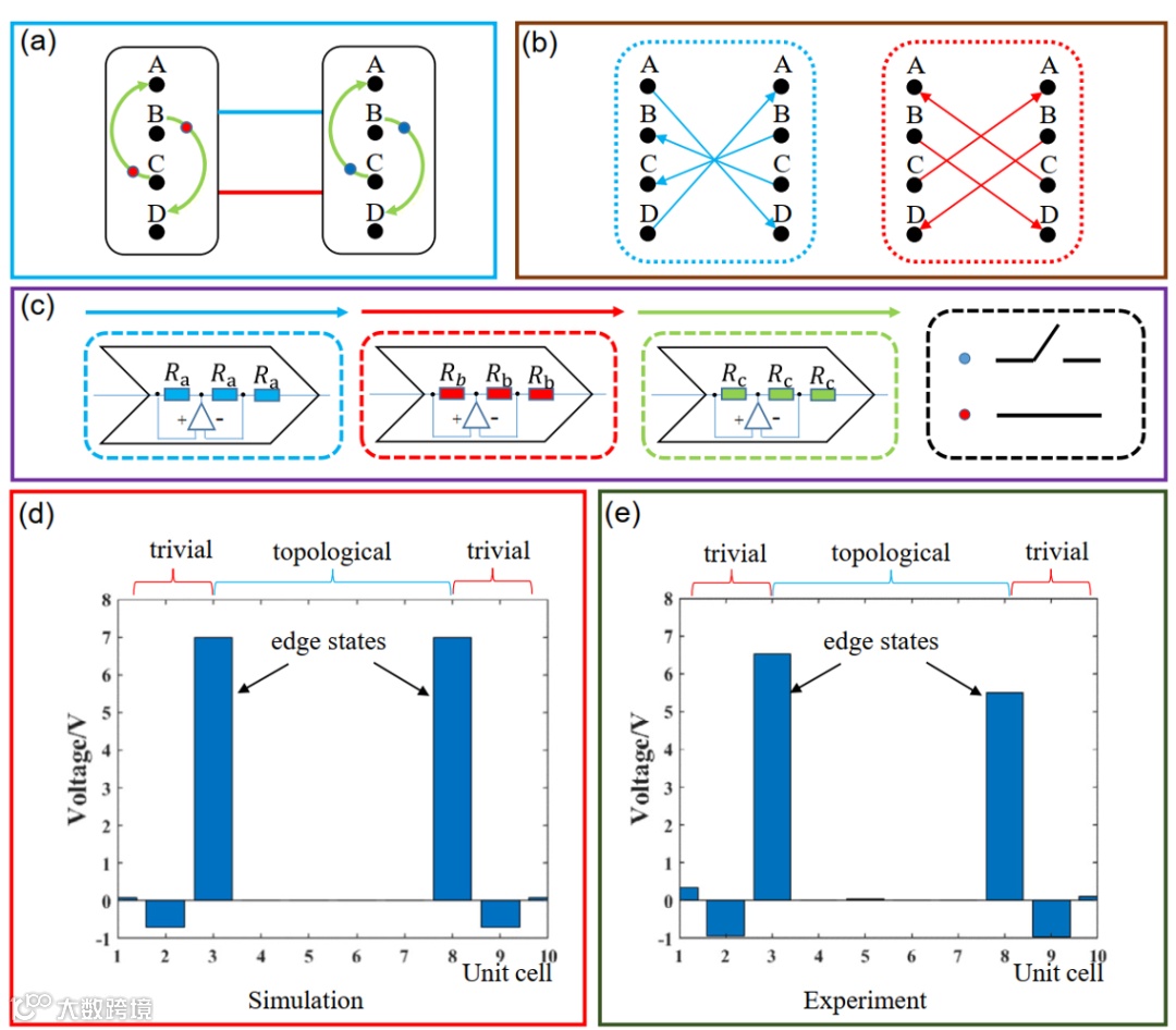 基于上述电路模型,研究人员可以在电路系统中研究Kitaev模型中的类马约拉纳边缘态。通过控制绿线上的开关来产生具有拓扑或平庸相位的电路段。对于具有拓扑和平庸相的电路网络,通过向网络输入外部电源,平庸段和拓扑段之间的边界处则会出现拓扑边缘态。这时如果改变边界处原胞中的绿线开关,拓扑边缘态就会被转移到相邻原胞。这意味着可以沿着电路网络自由地移动拓扑边缘态。