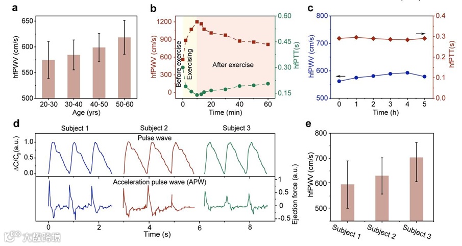 图4. 通过指尖脉搏波测试实现hfPWV的获取。(a)hfPWV随年龄的变化趋势。(b)hfPWV与心脏-指尖脉搏波传导时间(hfPTT)在运动前后发生的变化。(c)对一位25岁测试者进行5小时连续脉搏监测过程中hfPWV与hfPTT的变化趋势。(d)3位年龄近似(50岁左右),动脉硬化状况不同(从左到右逐渐严重)的测试者的脉搏波与加速脉搏波(APW)。(e)通过计算得到的(d)图中3位测试者的hfPWV。