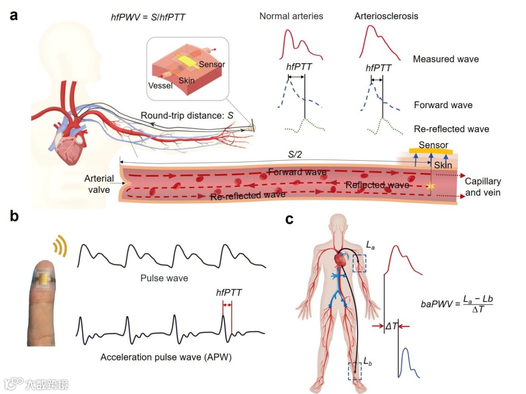 图1. 单点法脉搏波传导速度测试的机理。(a)hfPWV测试机理示意图。(b)典型的指尖脉搏波与相应的加速脉搏波。(c)传统两点法baPWV测试的机理。