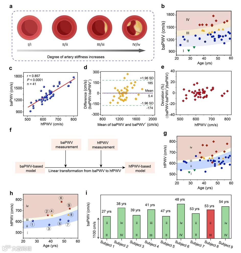 图5. hfPWV在动脉硬化评估诊断中的应用。(a)动脉硬化的4种不同程度,从i到iv逐渐严重。(b)通过baPWV与年龄划分的41位测试者的动脉硬化程度。(c)hfPWV与baPWV的线性拟合。将hfPWV线性转换为baPWV’后,对41位测试者baPWV与baPWV’的一致性评价。(e)41位测试者baPWV与hfPWV的偏差。(f)从基于baPWV对动脉硬化评价标准到基于hfPWV的评价标准的转换流程。(g)基于hfPWV标准的41位测试者的动脉硬化程度。(h)采用hfPWV标准后对9位新测试者的动脉硬化程度的评判。(i)采用baPWV与hfPWV标准下对9位新测试者动脉硬化程度评估的比较。