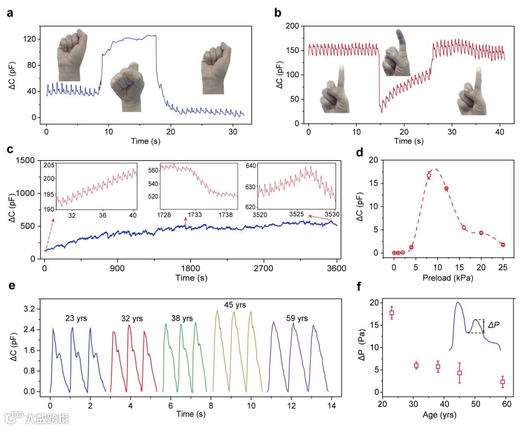 图3. 离电传感器对指尖脉搏的检测性能。(a)手腕关节运动过程中桡动脉脉搏的记录。(b)手指弯曲过程中指尖脉搏的记录。(c)自然状态下传感器对测试者1个小时的脉搏记录。(d)一位25岁男性测试者在不同预压力下脉搏主波(冲击波)的强度。(e)传感器对不同年龄健康测试者典型脉搏的记录。(f)测试者潮波高度随年龄的变化。