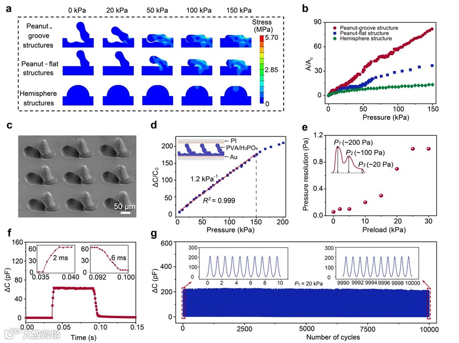 图2. 高性能离电传感器的工作原理与性能。(a)具有线性响应的微结构、凸起-平面结构、半球结构在压力下的变形行为与应力分布的力学模拟。(b)三种结构在压力下接触面积变化的力学模拟。(c)具有线性响应的微结构的表面形貌图。(d)离电传感器电容随压力的变化。(e)不同预压力下传感器对小压力的分辨率。(f)响应时间。(g)传感器在20 kPa压力下10000次循环测试性能。
