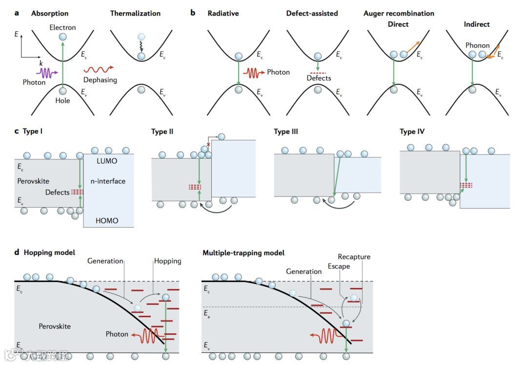 图1. 金属卤化物钙钛矿活性层内的电荷载流子产生与复合动力学机制