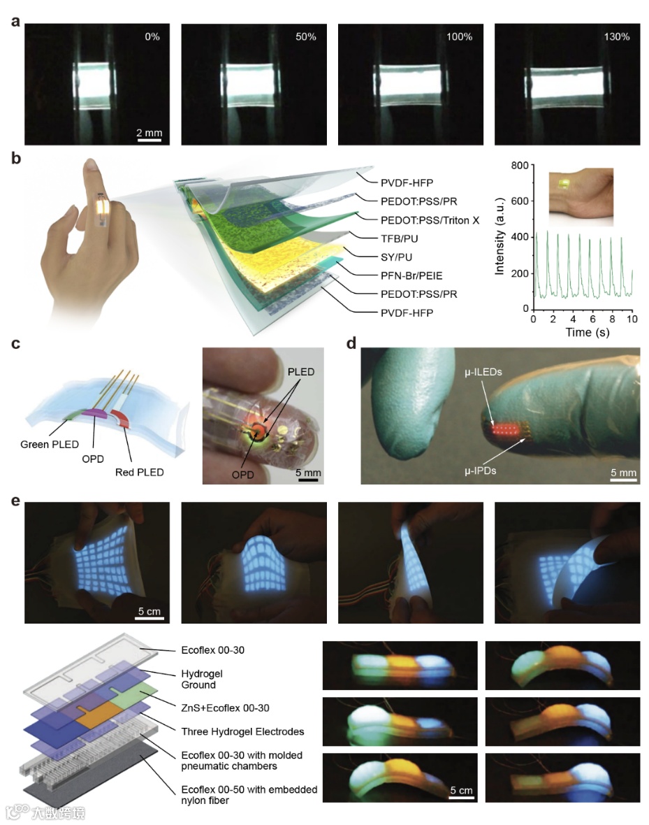电子器件已从刚性发展到柔性。在过去十年中,柔性电子器件已在能量收集和存储、健康传感、疾病监测和治疗,以及最新的智能辅助控制系统等众多领域中得到广泛应用。与人体贴合的发光器件将成为下一代柔性电子器件中重要的人机交互界面。由于生物系统是柔软、复杂和动态的,因此这些发光器件的机械性能必须与人体相匹配,为满足这一要求,需要对发光器件的结构和材料进行精心设计。