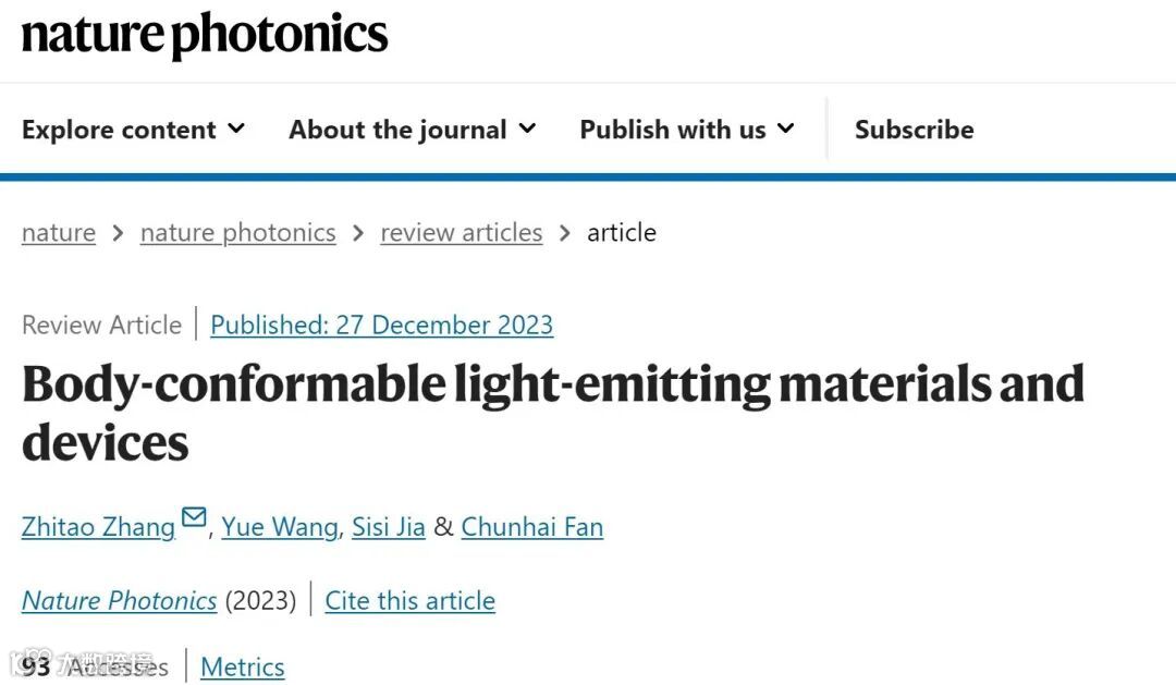 2023年12月27日,上海交通大学化学化工学院、张江高等研究院张智涛副教授团队在国际顶级学术期刊Nature Photonics上发表综述性论文“Body-conformable light-emitting materials and devices”。该综述论文系统性地总结了可穿戴发光织物、可贴合发光电子皮肤和可植入发光生物器件三种与人体贴合的发光器件的最新研究进展,重点讨论了发光材料与器件的设计策略及相关应用,并强调了目前提高器件性能、推广实际应用所面临的关键挑战和问题。张智涛副教授为论文的第一作者与通讯作者,上海交通大学为论文第一完成单位。
