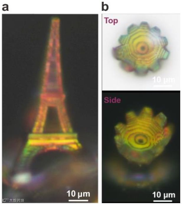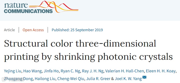 近期,新加坡科技大学的研究人员发明了3D打印的光子晶体,通过一种热诱导收缩工艺,使其晶格常数降低5倍,实现了100纳米以下的特征及各种颜色,研究人员使用这些光子晶体作为3D彩色元素,成功地打印出了第一个彩色3D微观结构模型,其高度仅为39 µm,彩色像素大小为1.45 µm。