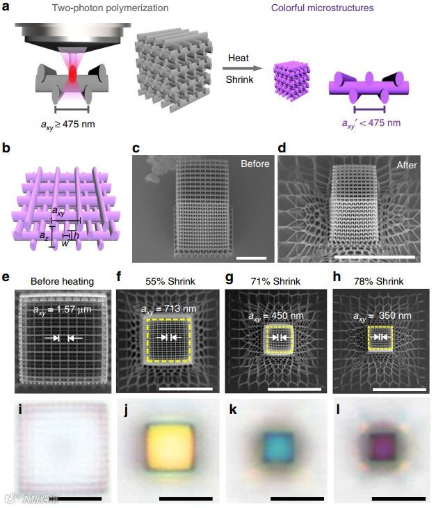 研究人员使用双光子光刻系统(Nanoscribe GmbH Photonic Professional GT)和商用的丙烯酸酯光致抗蚀剂IP-DipTM直接打印出聚合物光子晶体,如图3a所示,其轴径小至475nm;随后,在氩气环境中将光子晶体加热到450±20°C,使得光子晶体减小约80%,进而生产出最小晶格约为280nm的结构,远远超出了现有双光子聚合光刻系统分辨率的极限。