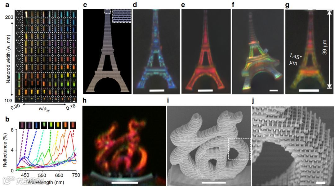 除此之外,研究人员制作了艾菲尔铁塔和新加坡艺术科学博物馆的全彩色3D打印件,进而证明了打印3D彩色结构的能力,如图4f和图5所示,制作的埃菲尔铁塔3D模型高度仅为39µm,包括绿色,橙色和紫红色。该模型可实现的最小彩色像素尺寸仅有1.45µm。