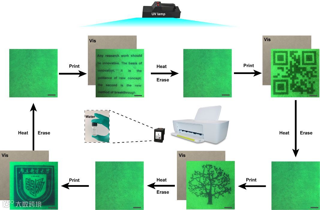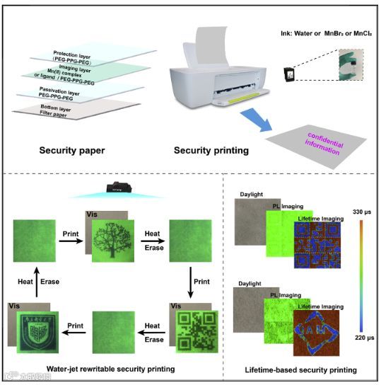然而,这些荧光墨水不易被擦除,多为一次性使用,这不仅提高了安全打印的成本,还会导致一系列的环境问题。此外,使用荧光安全墨水记录的信息容易被破解,不适用于经济或军事领域。因此,发展可擦除、高级别的安全打印技术具有重要的科学意义和应用价值。