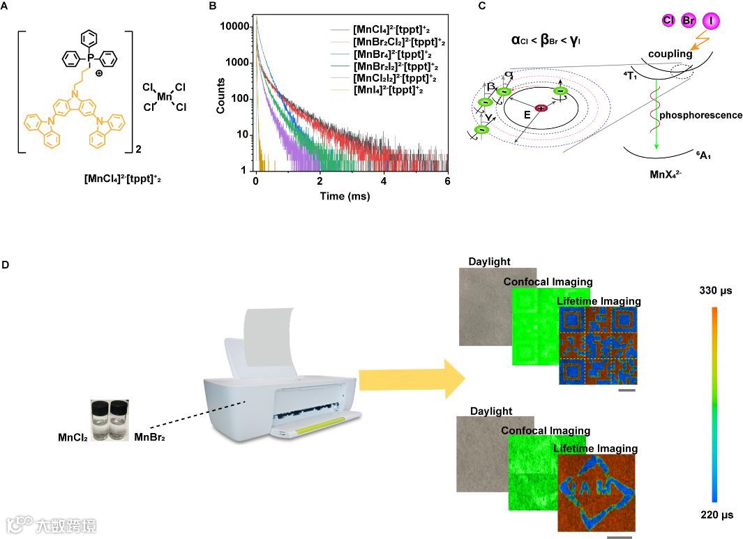 进一步,基于这种便捷的发光寿命调控性能,作者发展了一种基于寿命的安全打印。利用MnCl2和MnBr2的水溶液作为“隐形墨水”,将加密的信息打印在涂抹膦配体的安全纸上,可记录在环境光与紫外光下都不可见的信息。信息只有通过发光寿命成像(PLIM)分析才会显示,进而提高信息保护的安全性,不被一般方法破解(图4D)。