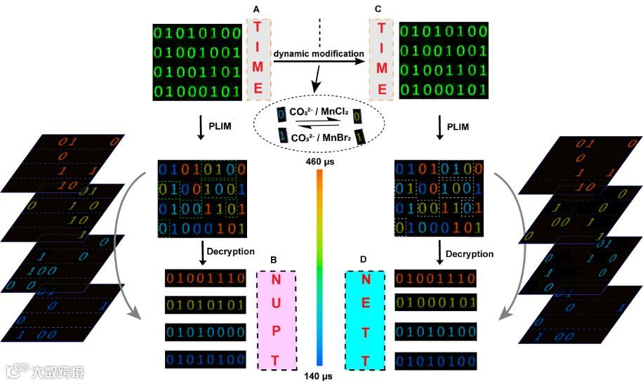 基于锰配合物发光寿命可动态调控的特点,作者实现一种高级别的安全打印技术。利用不同发射寿命的锰化合物作为墨水,直接在纸张上打印二进制代码。这些二进制代码在405 nm的激发下显示出具有相似强度的绿光,可以很容易地将其解码为“ TIME”(图6A)。当使用PLIM显微镜分析时,由于二进制代码的发射寿命的显著不同,它们显示不同的颜色。随后按照发射寿命的顺序重新排列二进制代码可将信息解码为“ NUPT”(图6B)。