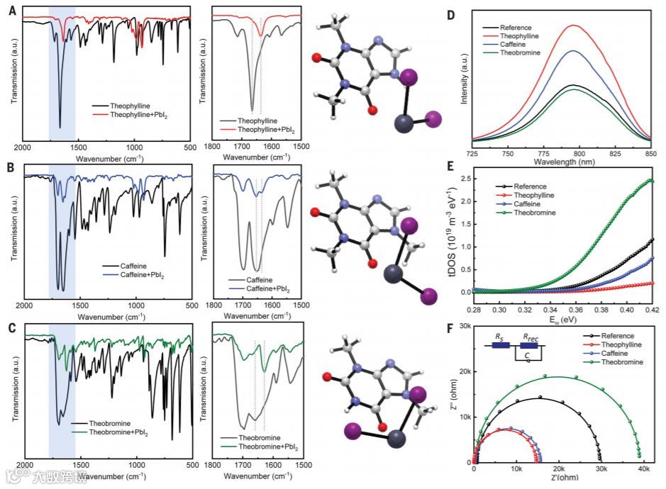 图2. 表面缺陷与小分子之间相互作用的研究,(A)纯茶碱和茶碱-PbI2膜的FTIR光谱,(B)纯咖啡因和咖啡因-PbI2膜,(C)纯可可碱和可可碱-PbI2膜。(D)没有和有小分子处理的钙钛矿薄膜的PL光谱。(E)钙钛矿型太阳能电池中经过或未经过小分子处理的tDOS。(F)钙钛矿型太阳能电池经过或不经过小分子处理的EIS谱。