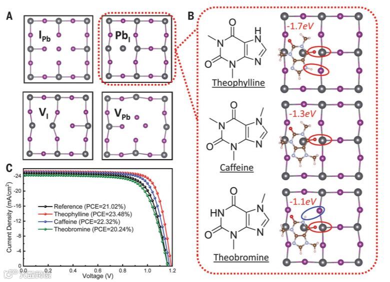 图1.三个表面C=O基团的表面缺陷识别和构造构型不同的化学环境,(A)各种类型的表面缺陷的俯视图。(B)钙钛矿与茶碱,咖啡因和可可碱PbI反位分子表面钝化的理论分子模型。(C)在有或没有小分子处理的情况下,钙钛矿型太阳能电池在反扫J-V曲线。
