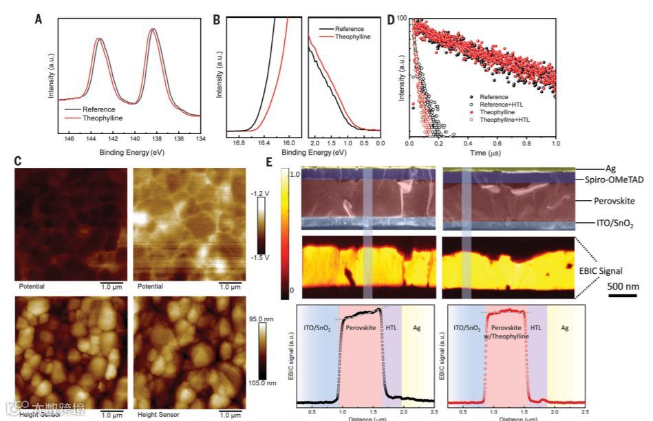 图3. 钙钛矿薄膜的特性以及茶碱处理的界面,(A)Pb 4f 7/2和Pb 4f 5/2的XPS光谱。(B)有或没有茶碱处理的钙钛矿薄膜的UPS光谱。(C)AFM和钙钛矿膜经过(右)或不经过(左)茶碱处理的KPFM图像。(D)茶碱处理前后钙钛矿薄膜的时间分辨PL光谱。(E)横截面SEM图以及相应的EBIC图像和线轮廓(右)或不(左)茶碱处理钙钛矿型太阳能电池。