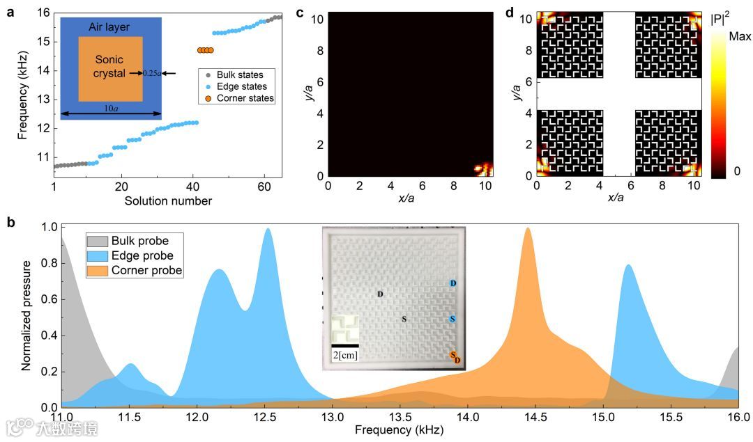图4. 第二带隙中由四极子极化产生的角态的计算和实验表征。a.四方超原胞中角态的本征态模拟。b. 3D打印样品中透射谱的实验测量,其中角态的响应曲线为橘黄色线/阴影,可以看出其响应位置位于体带隙和边界态的带隙中。c-d.角态的声场实验扫描和数值模拟图。可以看到,激发的声场主要局域在角上,远离角声场快速衰减。这些特征与角态相符合。