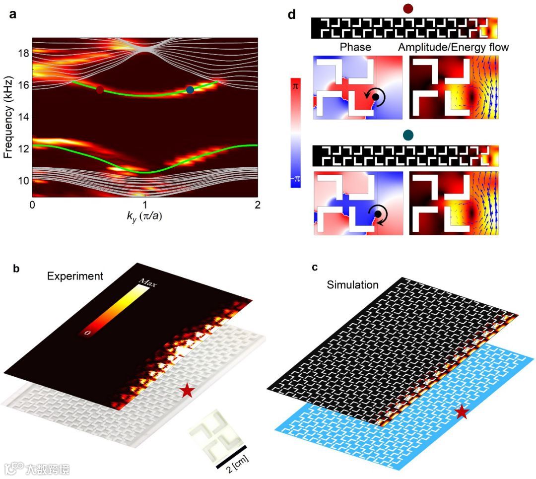 图3. 第二带隙中由四极子极化产生的边界态的理论计算及实验表征。a.一维超晶格的投影能带。线图代表模拟计算结果,颜色图代表实验测量结果。在体带隙中发现局域的拓扑界面态(由绿色线表示)。b-c.分别为边界态的声场实验扫描和数值模拟图。可以看到,激发的声场主要局域在边界上,远离边界声场快速衰减。这些特征与边界态相符合。d.携带相反角动量(即携带相反赝自旋)的边界态中的相位分布和能流方向。
