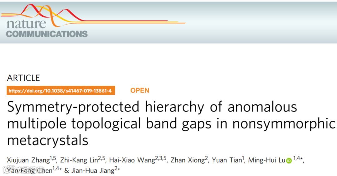 近日,南京大学固体微结构物理国家重点实验室、人工功能材料江苏省重点实验室、材料科学与工程系及人工微结构科学与技术协同创新中心的卢明辉、陈延峰的研究团队,与苏州大学蒋建华的研究团队合作,在拓扑物理和材料研究方面取得重要进展。他们发现了一种新型多级拓扑绝缘体,其不同的带隙各自支持相应的偶极子和四极子极化,分别表现出声学类自旋霍尔效应和异常声二阶拓扑现象。基于一类非点群声学结构,并通过精确设计和3D打印技术实现了这种新型声拓扑绝缘体。文章以“Symmetry-protected hierarchy of anomalous multipole topological band gaps in nonsymmorphic metacrystals”为题发表于近期的Nature Communications。
