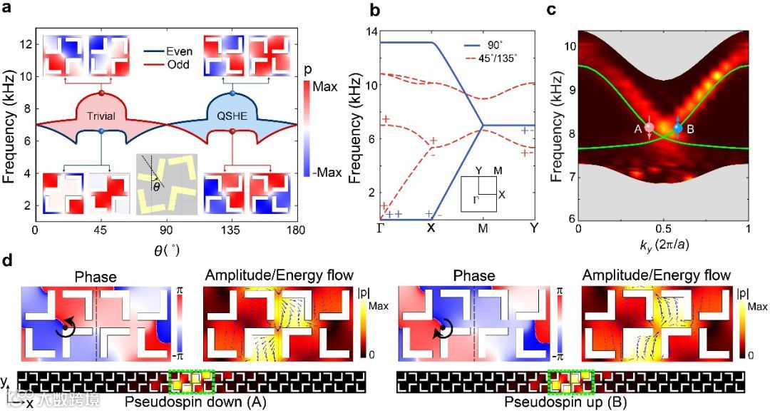 图5. 第一带隙中偶极子极化导致的声学类量子自旋霍尔效应及其无带隙的边界态表征。a.通过旋转散射体,系统的体能带结构在布里渊区M点呈现带隙闭合到打开的过程,显示出拓扑转变。b.不同旋转角度下声子晶体的能带结构。c.无带隙边界态的表征。线图代表模拟计算结果,颜色图代表实验测量结果。在体带隙中发现无带隙的拓扑界面态(由绿色线表示)。d.携带相反角动量(即携带相反赝自旋)的边界态中的相位分布和能流方向。
