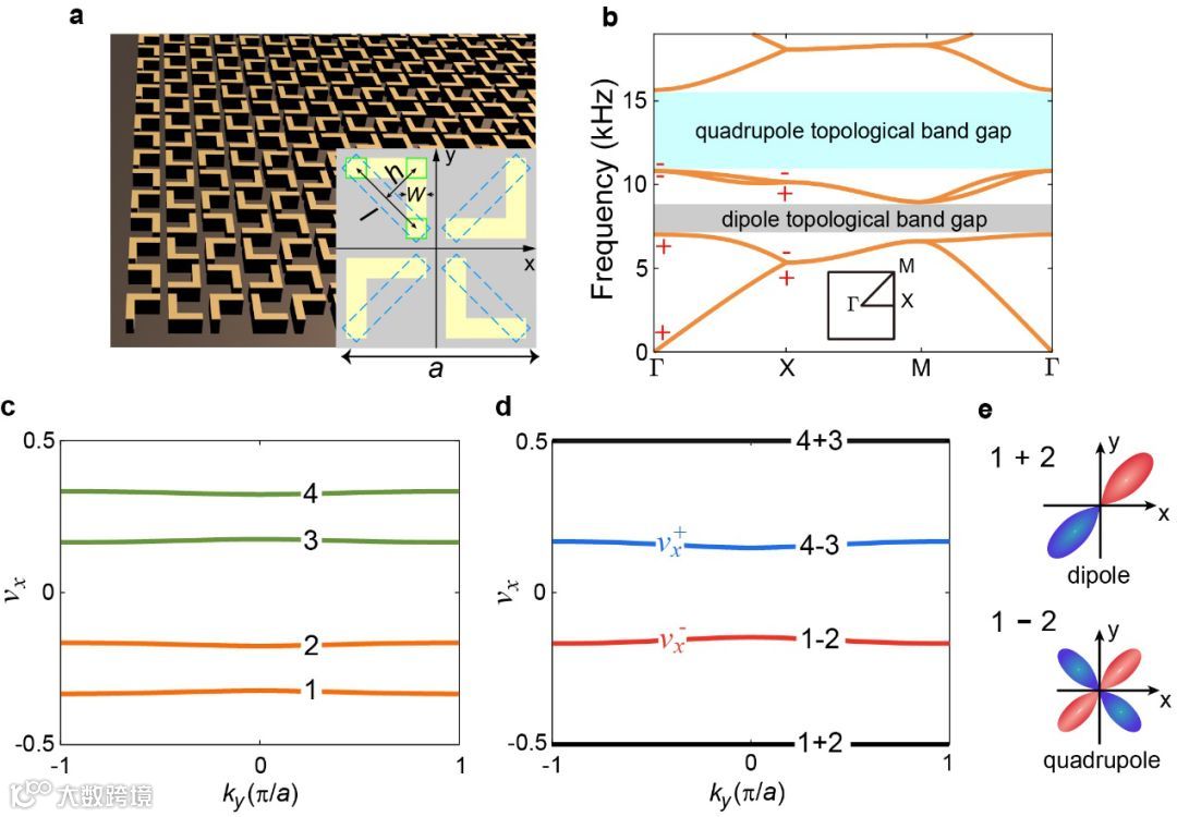 图1. 非点群声子晶体中受对称性保护的多级拓相。a.文章设计的非点群声子晶体,其中插图表示一个周期单元。b. 多级拓扑绝缘体的体带结构,其第一带隙支持量子化的偶极子极化而第二带隙支持量子化的四极子极化,受非点群p4g空间对称性保护。插图表示第一布里渊区。能带结构中的“+、-”代表高对称点Γ和X上的模式宇称(“+”表示偶宇称,“-”表示奇宇称)。c.异常四极子带隙中有能隙且非简并的瓦涅尔能带。d. 加和和相减分区的瓦涅尔能带。e.不同分区中瓦涅尔轨道(Wannier orbits)的线性组合可形成偶极子极化或者四极子极化(示例图)。