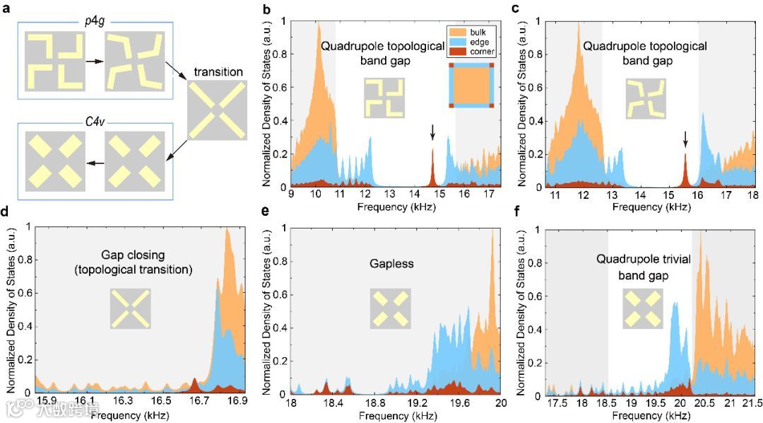 进一步研究发现,调制系统的几何结构可以触发第二带隙中的四极子拓扑相变,从而验证了这一声学系统中对称性与拓扑的关系。具体来讲,文章研究了下述的几何调制:首先降低拱形散射体的高度直到其降为0(如图2a中前三个结构所示),然后减小拱形臂的长度(如图2a中第四个结构所示),最后增加拱形臂的厚度(如图2a第五个结构所示)。在这一几何调制的过程中,为系统从非点群p4g空间对称性到点群C4v对称性的几何相变点,这正对应于第二带隙中四极子的拓扑相变,从而完美地揭示了对称性和拓扑的相互作用。如上文所讲,四极子带隙中支持拓扑角态,因而可以利用体带隙的闭合和角态的消失来表征这一伴随着几何变换的拓扑相变。具体地,文中用角、边以及体中的局部态密度加以描述。计算结果显示,当结构具有p4g空间群对称性时,其表现出四极子拓扑绝缘体特有的性质,即体带隙中拥有带带隙的边界态和处于边界态带隙中的角态(见图2b-c);经过几何相变,体带隙闭合、角态消失(见图d-e);当结构经过几何相变之后具有C4v点群对称性,即便再次打开带隙,带隙中原本由于四极子导致的角态也不再出现(见图2f),证明几何相变正对应于四极子的拓扑相变,经过拓扑相变,四极子极化消失。