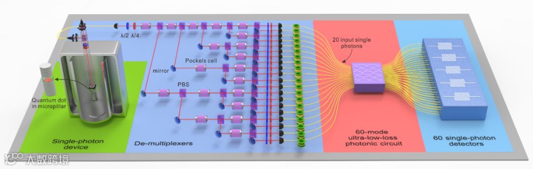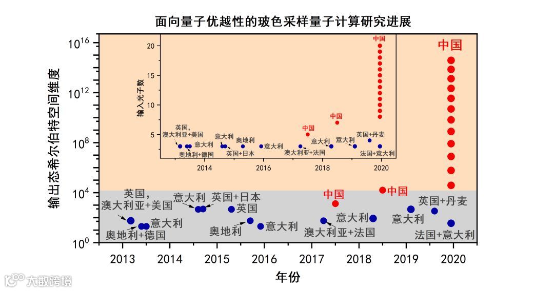 中国科大研究组利用自主发展的国际最高效率和最高品质单光子源、最大规模和最高透过率的多通道光学干涉仪,并通过与中科院上海微系统与信息技术研究所尤立星在超导纳米线高效率单光子探测器方面的合作,成功实现了20光子输入60×60模式(60个输入口,60层的线路深度,包括396个分束器和108个反射镜)干涉线路的玻色取样实验。与牛津大学、维也纳大学、法国国家科学院、布里斯托大学、昆士兰大学、罗马大学、麻省理工学院、马里兰大学等研究机构的国际同行的类似工作相比,实验成功操纵的单光子数增加了5倍,模式数增加了5倍,取样速率提高了6万倍,输出态空间维数提高了百亿倍。其中,由于多光子高模式特性,输出态空间达到了三百七十万亿维数,这等效于48个量子比特展开的希尔伯特空间。因此,实验首次将玻色取样推进到一个全新的区域:无法通过经典计算机直接全面验证该波色取样量子计算原型机,朝着演示量子计算优越性的科学目标迈出了关键的一步。